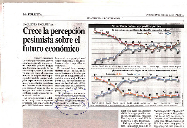 Reina honda preocupación en las filas del cristinismo. Una encuesta de la consultora ultra-K Ipsos-Mora y Araujo revela que la imagen presidencial, tras cuatro años y medio de gobierno (9 años si contamos la administración kirchnerista) desciende por debajo del 66%. Se ubica exactamente en el 65%. La noticia es pésima y Fontevecchia parece advertirlo. Por eso la esconde en una página par y la disimula con un título que habla de otra cosa. "Se anticipan los tiempos" titula con admonición sombría la tira en la cabeza de página. Es cierto: a Perfil se le anticipan los tiempos.